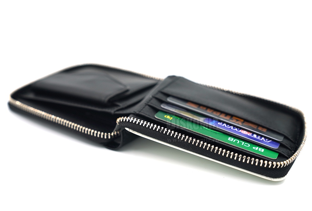 Компактный, удобный кошелёк на молнии, который отлично умещается в кармане. Внутри одно отделение для купюр, один карман для мелочи с клапаном на кнопке и три кармана для пластиковых карт.