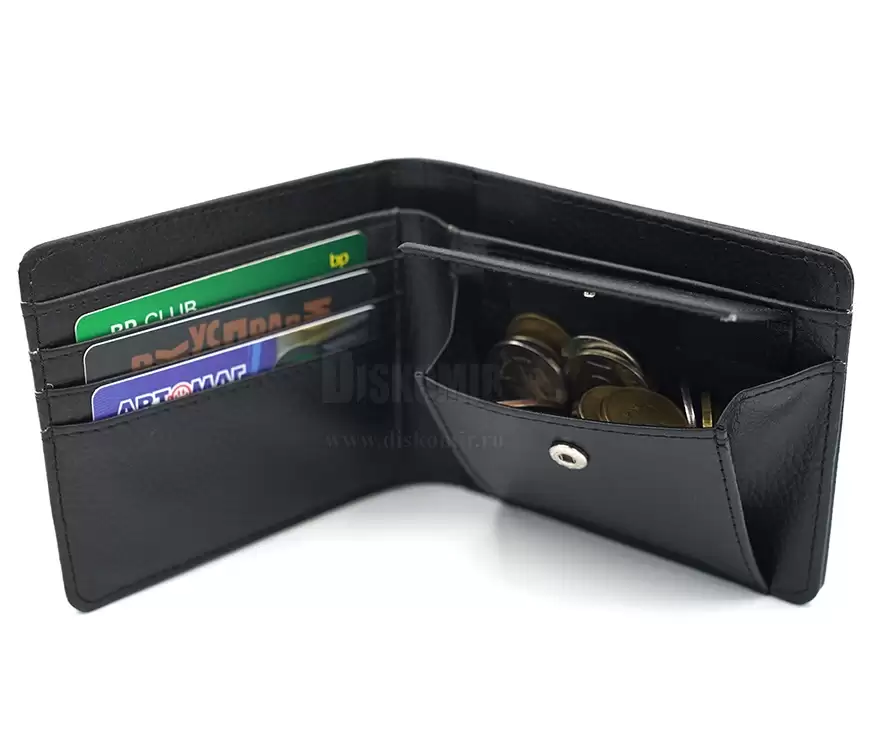 Компактный, удобный кошелёк, который отлично умещается в кармане. Внутри одно отделение для купюр, один карман для мелочи с клапаном на кнопке и три кармана для пластиковых карт.