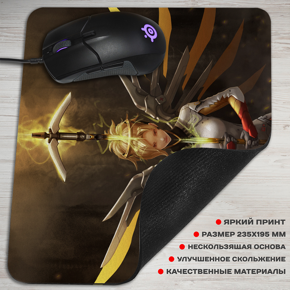 Коврик для мышки прямоугольной формы с изображением персонажа Mercy из популярной игры Overwatch. Изготовлен из высококачественного материала, обеспечивающего плавное скольжение мыши и точное позиционирование курсора. Прекрасный выбор для поклонников игры, которые ценят комфорт и стиль во время работы или игровых сессий. Удобный и эстетичный аксессуар для вашего компьютерного стола.