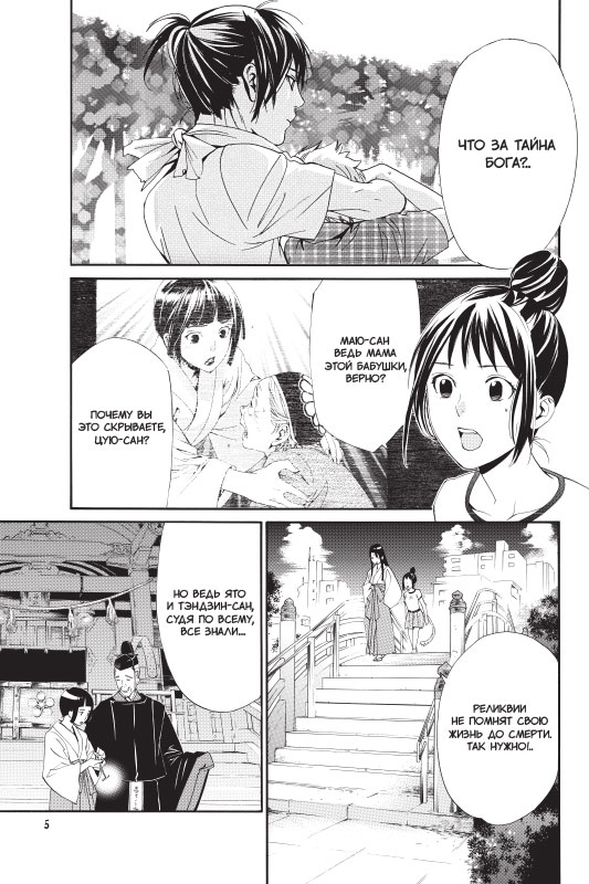 Издание содержит суперобложку и цветные иллюстрации. Хиёри узнает, что Фудзисаки — «отец» Ято. Он говорит Хиёри держаться от Ято подальше, но та не собирается сдаваться — и приходится вступить с Фудзисаки в открытое противоборство за душу Ято. Хиёри храбра и может постоять за себя, но что, если на кону окажутся благополучие и жизни дорогих ей людей? Ведь так легко поверить, что во всех несчастьях, что с ними происходят, виноват Ято — бог, рожденный, чтобы отбирать... Пока боги ждут начала собрания на Небесах, Бисямон освобождает реликвию счастья, которую заточили на тысячи лет. С ее помощью Бисямон готовится напасть на «отца» Ято, однако замысел рушится: Небеса высылают за ней карательный отряд во главе с Такэмикадзути. Теперь Ято предстоит сделать нелегкий выбор между дружбой, благосклонностью Небес и, возможно, собственной жизнью...