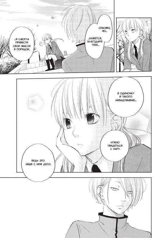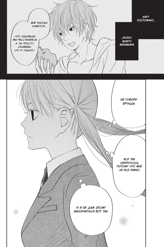 Прежде Сидзуку казалось, что они с Хару похожи и он способен понять ее как никто другой, но она все чаще замечает, что это совсем не так. На праздничном приеме брата Хару Юдзана чаша ее терпения переполняется — Сидзуку выходит из себя. После ссоры Хару перестает появляться в школе… Смогут ли они когда-нибудь понять друг друга? Даже если Хару искренне захочет выяснить, что на душе у Сидзуку, разве можно просто взять и признаться: «У тебя все есть, Хару, и я тебе завидую»?
