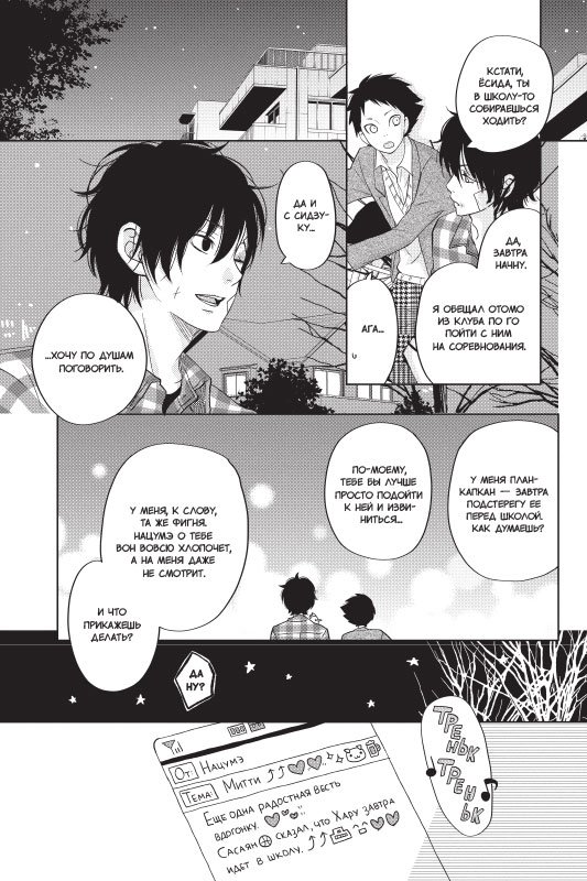 Что делать, если чувства невзаимны? Важно быть честным, даже если эта честность может кого-то ранить. Хару и давно влюбленная в него Осима понимают, что пришло время поговорить друг с другом откровенно, а Ми наконец набирается смелости объясниться с Нацумэ, которая тоже недавно призналась ему в любви. И Ямакэну тоже пора разобраться со своими чувствами и перестать обманывать если не Сидзуку, то хотя бы самого себя..