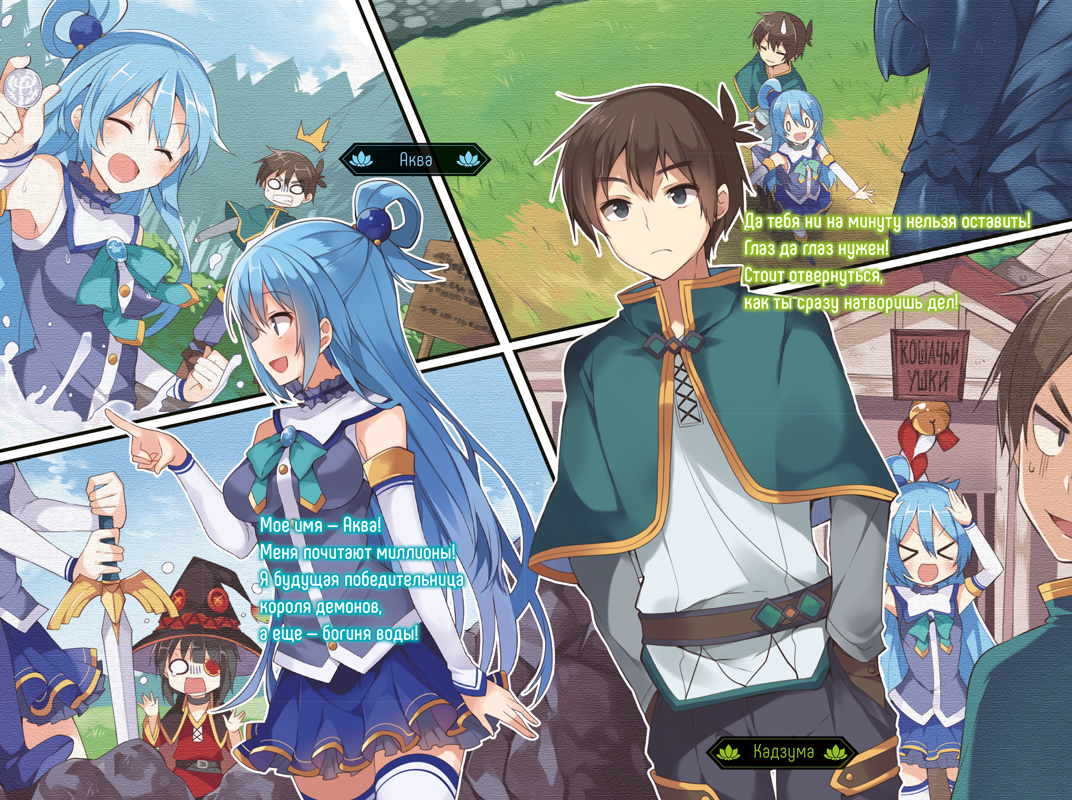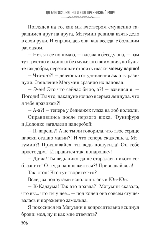 Кадзума Сато — обычный японский школьник, которому ничего не интересно, кроме как рубиться в любимые видеоигры и сидеть дома. Волею случая он оказался в другом мире, где все напоминает типичное фэнтези: магия, монстры, поднятие уровней... Звучит хорошо, вот только в соратниках у него богиня, вечно влипающая в неприятности, архимаг, способная лишь на одно заклинание в день, и крестоносец, обожающая, когда ее избивают враги. И теперь все вместе они обречены спасаться от гигантских лягушек и аллигаторов, а потом и вовсе выступить против жуткого всадника без головы! Как им выжить в этом прекрасном мире?..