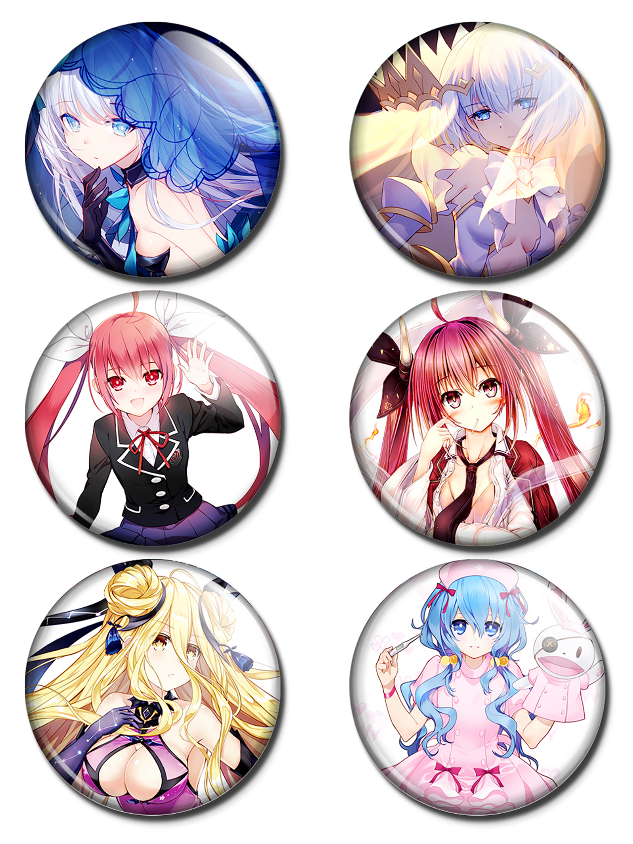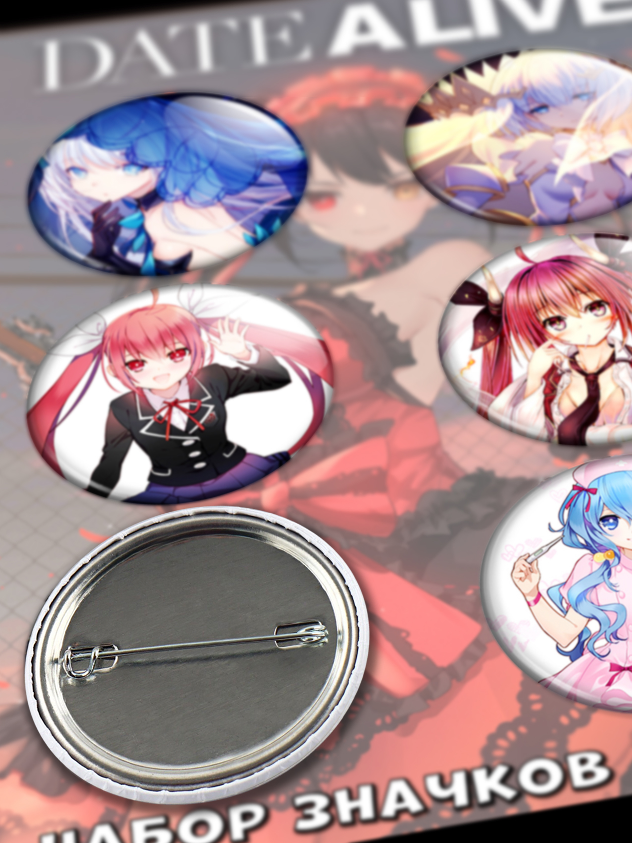 Набор из 6 значков размером 37 мм. Значки расположены на красочной картонной подложке и упакованы в пакет.