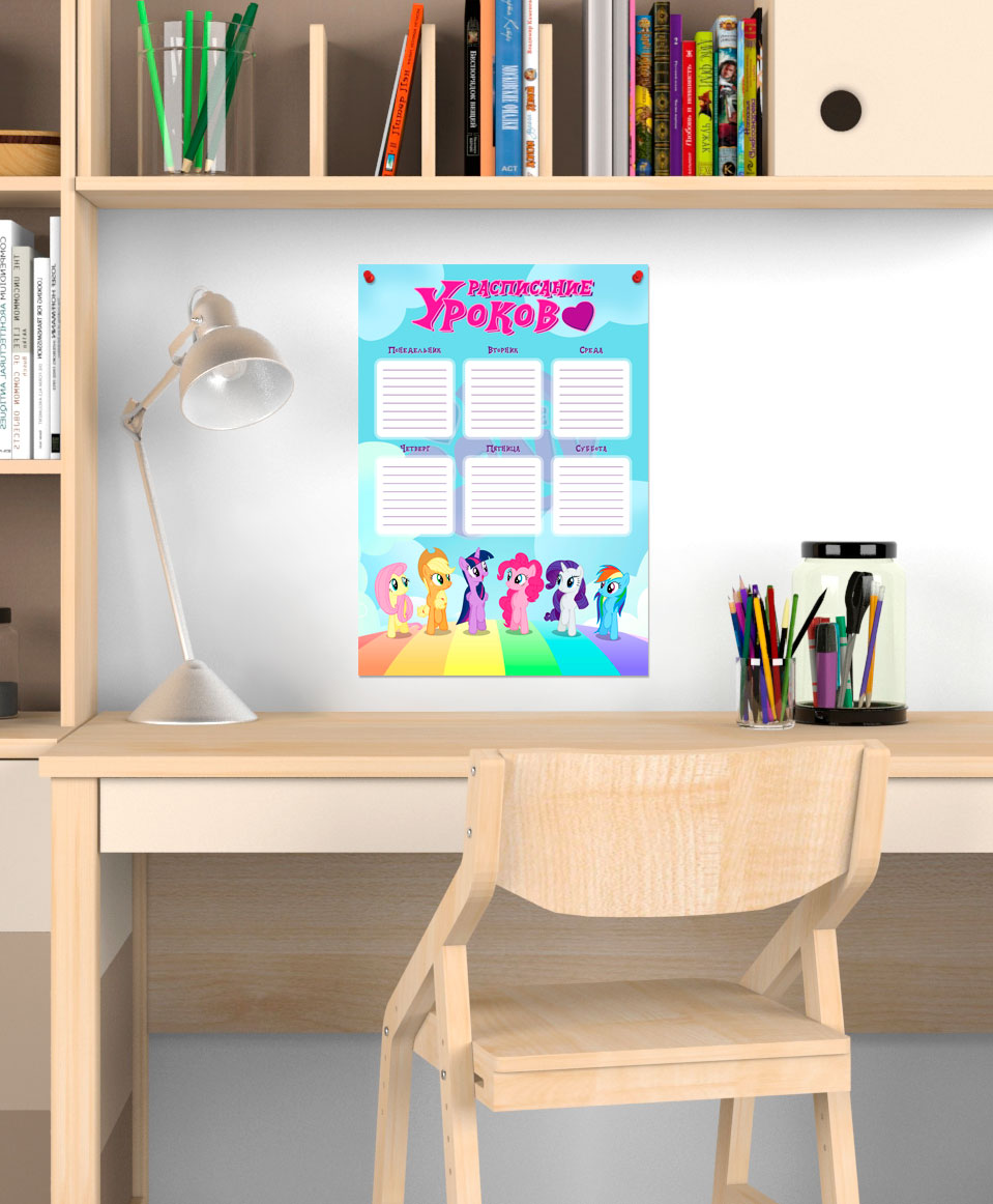 Школьное расписание с артом из My Little Pony прекрасно подойдет для украшения рабочего места школьника! Расписание уроков - это отличный способ помощи школьнику в организации своего учебного процесса. Имея перед собой расписание уроков на каждый день, ученик никогда не забудет взять в школу все необходимое. Это добавит ему уверенности в себе и положительно повлияет на учебный процесс, а яркий принт с любимыми героями будет радовать каждый день!