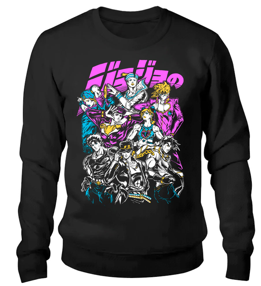 Свитшот с яркими принтами, украшенными изображениями ключевых персонажей из аниме «Невероятные приключения Джоджо» (JoJo’s Bizarre Adventure), выполнен с высоким качеством, принт сохраняет свою яркость и чёткость даже после многочисленных стирок. Изделие изготовлено из мягкого, тёплого материала, приятного наощупь. Свободный крой свитшота обеспечивает комфорт и удобство в носке, а длинные рукава создают дополнительную защиту от холода. Такой свитшот станет идеальным выбором для поклонников данного аниме и любителей удобной, стильной одежды.