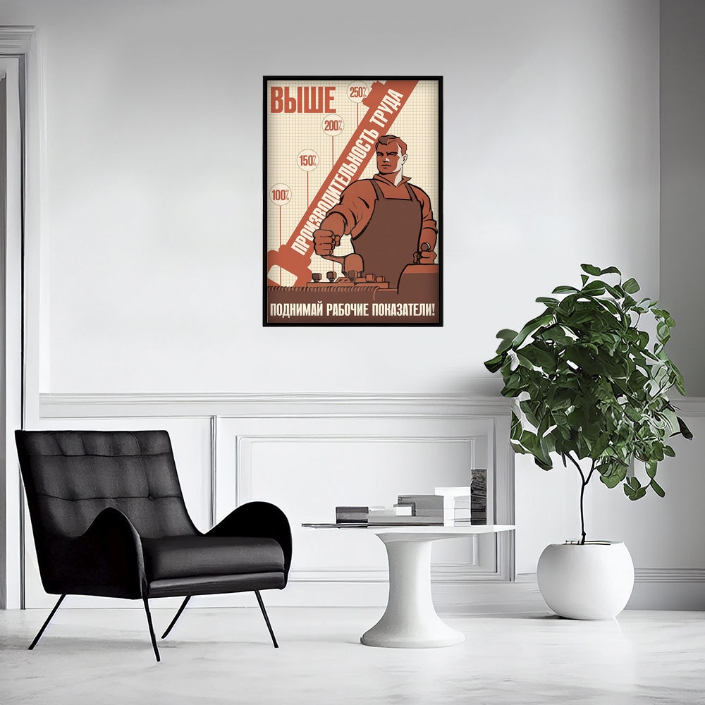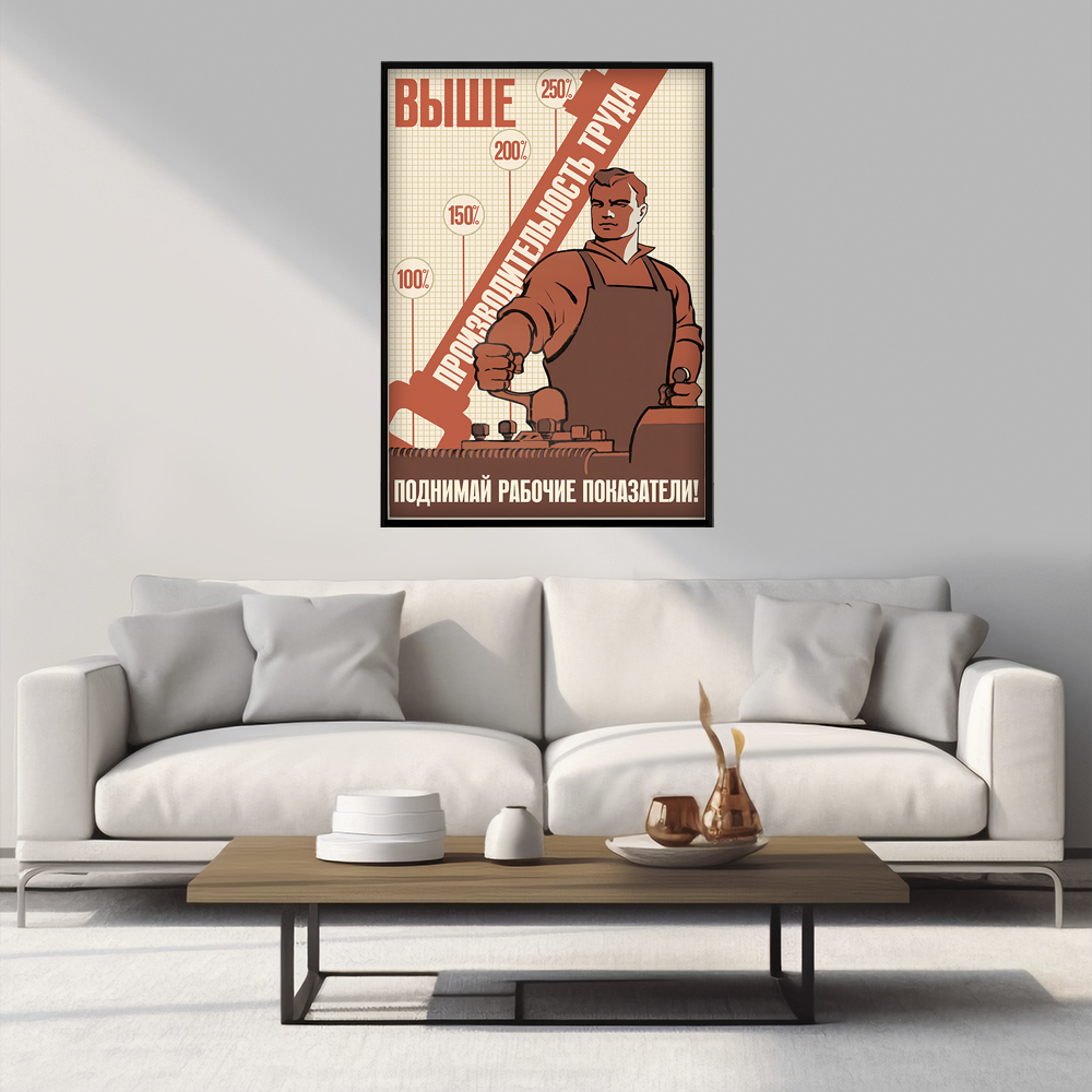 Постер СССР "Выше производительность труда. Поднимай рабочие показатели" - идеальное дополнение к интерьеру офиса или рабочего пространства. Этот стильный и мотивирующий плакат напомнит о важности улучшения рабочих показателей и повышения эффективности труда. Он не только украсит стену, но и станет постоянным источником вдохновения для достижения новых высот в работе.