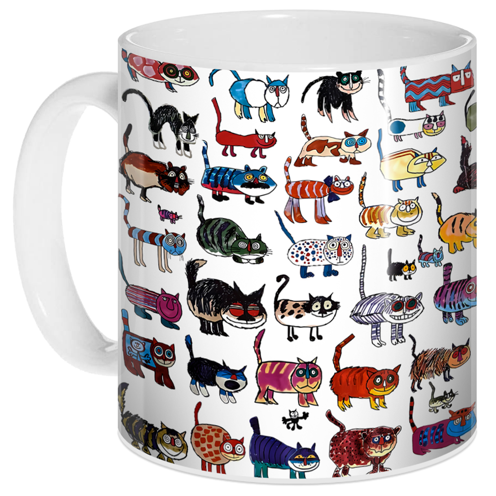 Кружка с яркими и забавными котами в стиле наивной иллюстрации. Каждая кошка — уникальная, с собственным характером и цветами. Идеально для детской комнаты, офиса или подарка любителю котов. Праздник котов на одном кружке! Забавные, полосатые, пушистые, круглые и смешные — эта кружка точно заставит улыбнуться.