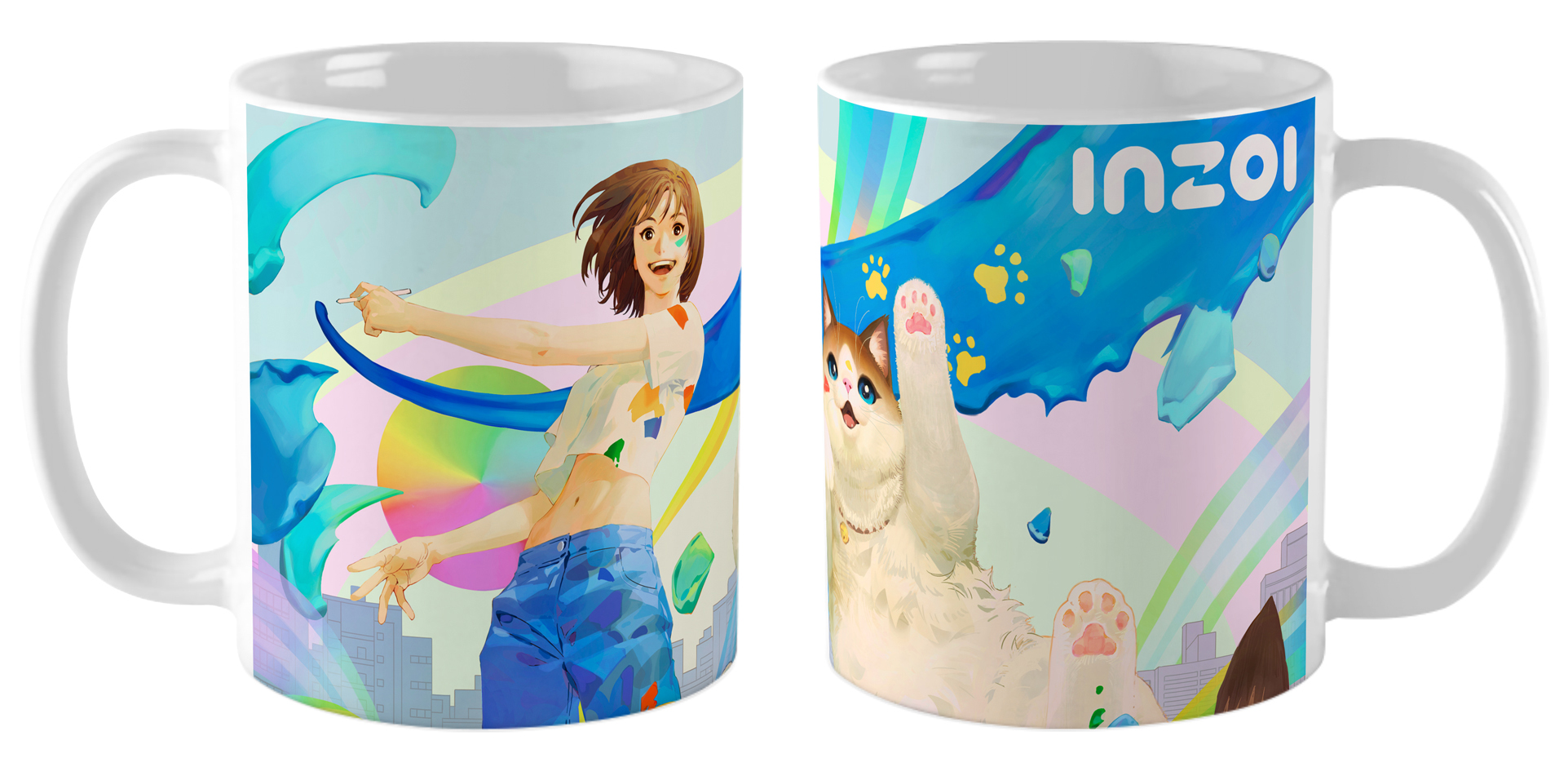 Кружка InZOI наполнена энергией творчества и игривого хаоса. На изображении в стиле игры изображена улыбающаяся девушка с развевающимся синим шарфом, чья динамичная поза передает радость и свободу. Рядом пушистый белый кот со следами краски на лапах выглядит одновременно удивлённым и довольным, усиливая атмосферу весёлого беспорядка. Яркий фон с радугами, облаками и городскими силуэтами создаёт ощущение праздника и безграничной фантазии. Эта кружка станет идеальным аксессуаром для тех, кто ценит в жизни креатив, спонтанность и яркие моменты простого счастья.