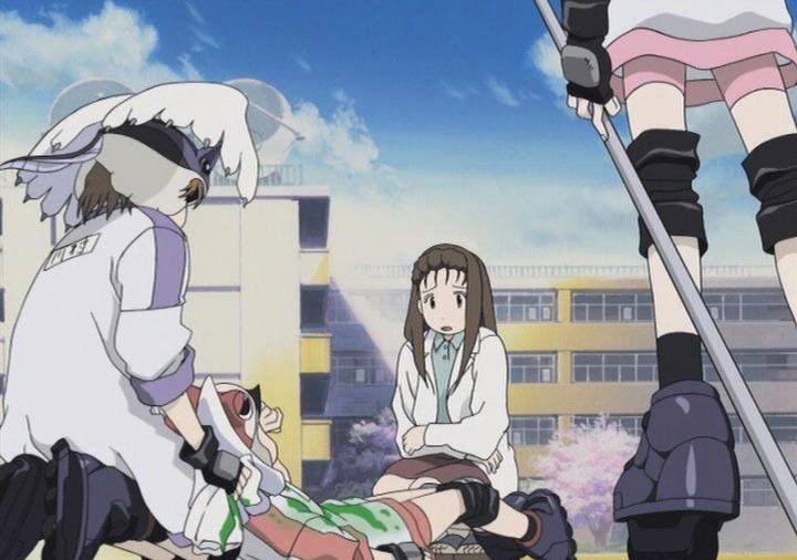 Alien 9 Alien Nine エイリアン9 エイリアン9 Производство: Япония Жанр: фантастика, психология, школа Тип: OAV (4 эпизода), 25 мин. Трансляция: c 25.06.2001 по 25.02.2002 Режиссёр: Фудзимото Дзиро Автор оригинала: Томидзава Хитоси © Анастасия Розанова, источник www.world-art.ru Только у нас и только для вас! Смертельный аттракцион: кавайные девочки вступают в симбиотические отношения с инопланетянами!!! Слабонервных, детей и беременных просят не смотреть… Инициатива наказуема. И правильно, и нечего: сперва надо определиться с жанром (хоть в общих чертах!), потом выставить индекс – кому льзя, кому не очень, а потом уж аниме снимать. А иначе получается, как с «Чужими 9». Свежий (не препарированный заранее) зритель не в силах понять, что же ему подсунули: странненькую комедию о плаксивых школьницах, «воинах на роликовых коньках» (a la 18-й сезон: «Неувядаемая Усаги-тян и Рыцари печально-инопланетного образа»), или психологический триллер о тяготах социального созревания среди космических мутагенов. Потому что, строго говоря, «Чужой 9» формально подходит под оба грифа – и «для детей» (в конце концов, ничего ТАКОГО нам не показывают, а разборки с инопланетными интервентами детям давным-давно привычны, как стихи Барто или Маршака), и «только для взрослых» (нам предлагают употреблять весь предложенный кавай явно не по назначению – зловеще не по назначению; подтекст же балансирует на грани текста). Итак, что мы имеем в сюжетной завязке? Интригующие «вводные»: школа номер 9 совмещена с космодромом для инопланетной нечисти; для поддержания порядка и санитарно-гигиенических норм учащимися избирается комитет по противодействию Чужим (на обычном школьном собрании, так же, как избирается, к примеру, редколлегия или ответственный за работу с подшефными). От класса «Камелия» избирается Юри Отани. Ей этого очень не хочется (тут же приводится в высшей степени показательная диаграмма: «Ежемесячная анкета учащихся: почему Вам не нравятся обязанности по противодействию «чужим»? Мне противно быть соединенным с «чужим» - 78%; меня тошнит - 9%; это грязно - 5%; это некрасиво - 4%; это утомительно - 3%; другое - 1%»). Для того, чтобы стать членом комитета, ученицы объединяются в группу под надзором учительницы Хисакавы, проходят инструктаж и получают (в качестве спецобмундирования и оружия) «чужого-защитника», который надевается на голову, как шлем. Как уже говорилось, Юри не желает быть членом комитета, носить «чужого» на голове, всё это страшно, неопрятно, утомительно, от этого тошнит… крупные слезы, супер-деформ кавайненького лица, занавес. Тем самым нам дана типичная завязка для сюжета: «не хнычь, возьми себя в руки, что ты, как не мужик?!» или, если хотите: «Баранкин, будь человеком!». Юри предложено (настоятельно предложено: «кто – не все, того накажут») стать спасителем человечества, а заодно победить свои собственные комплексы, слабости и предрассудки. И вот тут происходит «сбой программы»: Юри никак не начинает соответствовать. Плакать при первой схватке с инопланетянами – нормально и закон жанра. При второй – оно же. При третьей – избыточный реализм или неудачная попытка сделать посмешнее... А Юри всё никак не включается в заданную схему. Ей это по-прежнему не нравится. Зрители уже могут начать сердиться (и многие начинают): чего она не играет по правилам?! А другие, наоборот, принимаются беспокоиться и ер